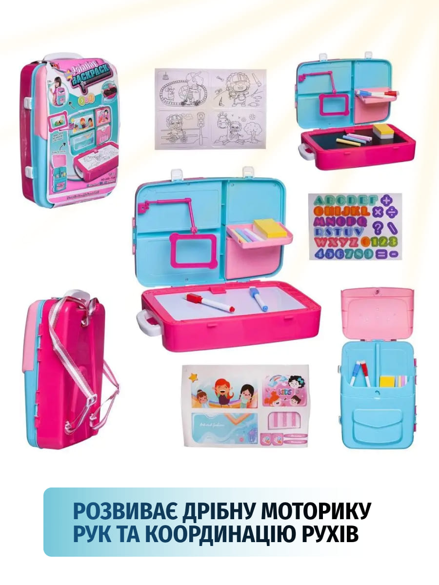 Усередині цієї чудової валізки-ранця зручно розміщені предмети для розвитку творчих здібностей дитини.